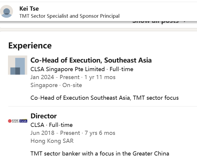 担任执行部门联席主管的Kei Tse职业轨迹更具代表性:她自2018年6月起以TMT领域银行家身份加入中信里昂香港团队,2024年1月晋升执行部门联席主管。此前她曾在海通国际和招商证券任职,跳槽至中信里昂前已是招商证券英国副总裁,拥有跨机构、跨地域的复合型从业经验。