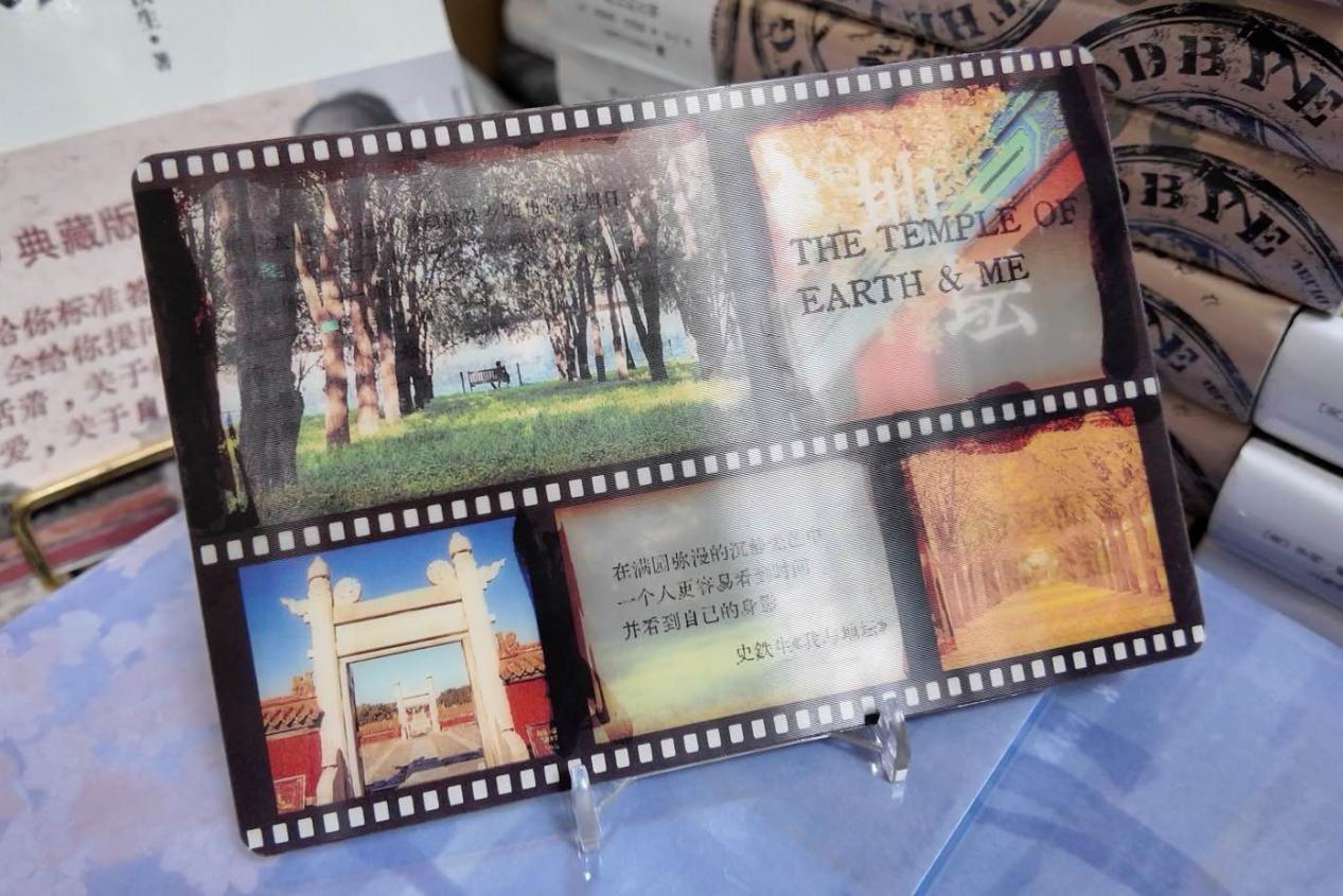 此外,她还向记者展示了他们为本次地坛书市特意设计的“光栅卡”,上面印有作家史铁生《我与地坛》的摘句,以及地坛公园银杏大道等经典场景的照片。在不同的视角下,光栅卡可以呈现出不同的图案,卡片背面则设计成明信片样式。