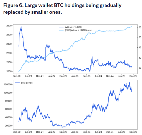 花旗的最新报告揭示了当前调整背后的关键驱动力:链上数据显示,比特币“巨鲸”(大额持有者)正在逐渐减少,而小额“散户”钱包的持有量却在增加。这一现象与四年周期理论高度吻合,即在周期尾部,聪明资金通常会向新进入者出售比特币。