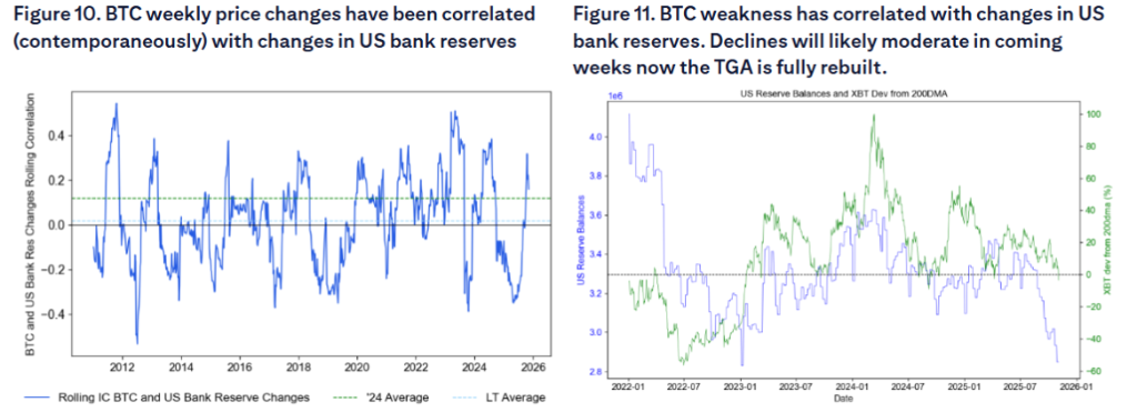 花旗报告特别强调,加密货币对银行流动性状况“非常敏感”。研究显示,比特币的周价格变化与美国银行准备金的变化呈现同步相关性,银行准备金的下降往往伴随着比特币的疲软表现。这种敏感性使得比特币成为流动性收紧最早、最敏感的受害者。