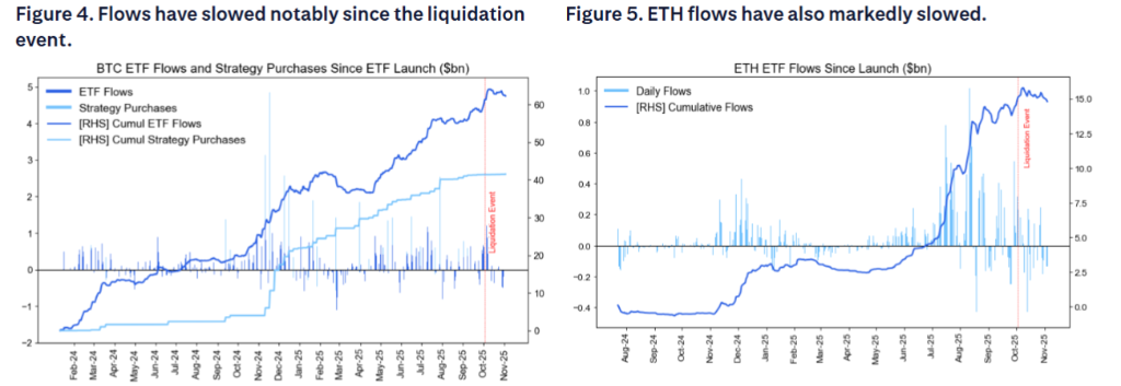 此外,美国现货比特币ETF的资金流入在过去几周显著减少,这出乎市场预期,因为ETF资金流本被认为相对免疫于期货和去中心化交易所的10月10日“黑色星期五”清算事件。以太币ETF的资金流入同样明显放缓。