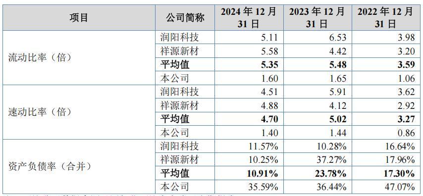 2022年-2024年,公司资产负债率分别为47.07%、36.44%和35.59%,高于同行业可比公司平均水平17.30%、23.78%和10.91%。