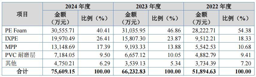 新恒泰产品种类众多,包括PEFoam、IXPE、MPP、PVC耐磨层等,其中PEFoam主要应用于建筑装饰、婴童用品、包装、鞋材等领域;IXPE和PVC耐磨层主要应用于建筑装饰材料领域;MPP主要应用于新能源电池、通信领域。公司各期IXPE及PVC耐磨层、MPP产品收入持续增长,同行业可比公司祥源新材、润阳科技2021年以来净利润持续下滑。