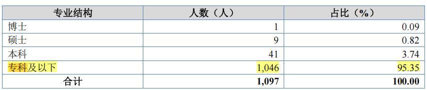 员工学历专科及以下占比95.35%,销售、管理占比低于均值