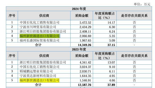新恒泰前五大供应商中,有一家福州新世源进出口有限公司,成立于2023年5月17日,当年即成为公司第五大供应商,向公司销售了1546.91万元,次年向公司销售了2066.69万元,参保人数为4人。其法人为叶丹丹100%持股,监事为王超。