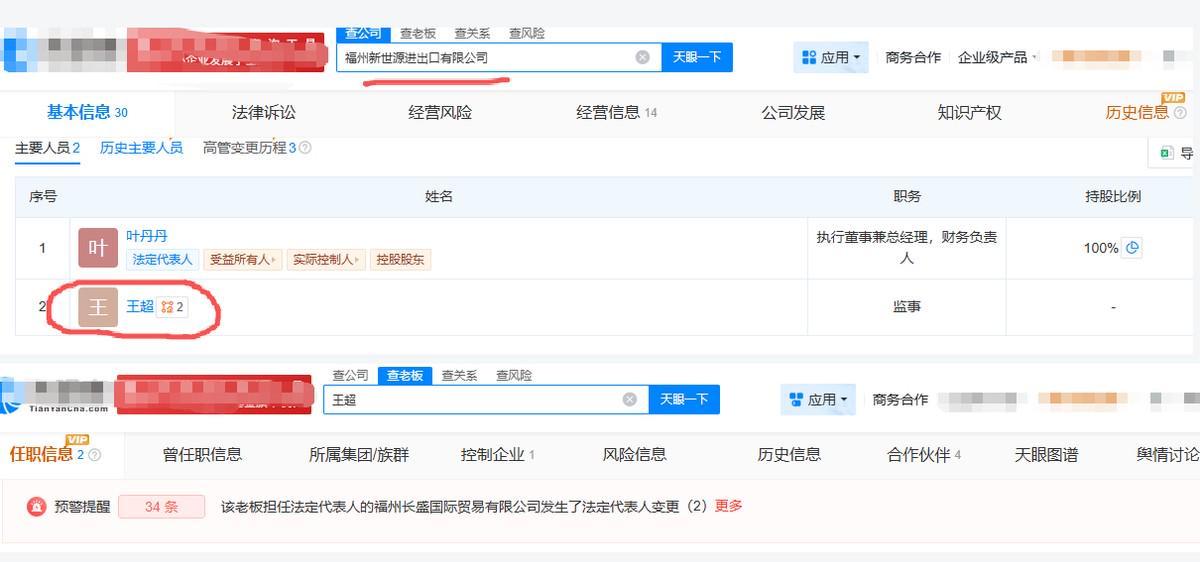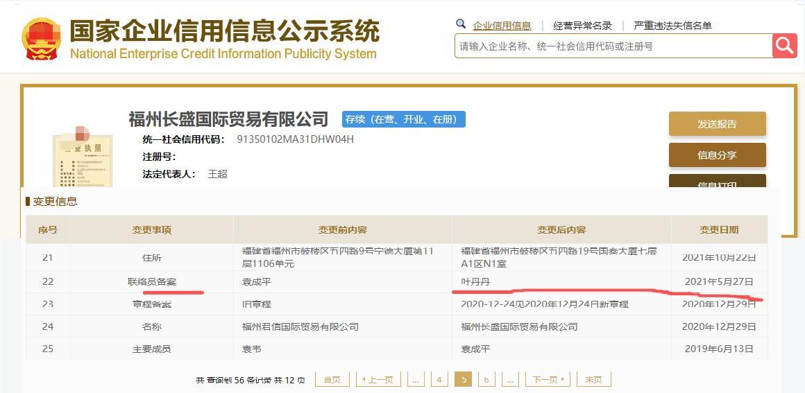 据国家企业信用网上,找到了更确切的信息,叶丹丹2021年5月27日福州长盛国际贸易有限公司变更信息出现过,备案为公司的联络员。