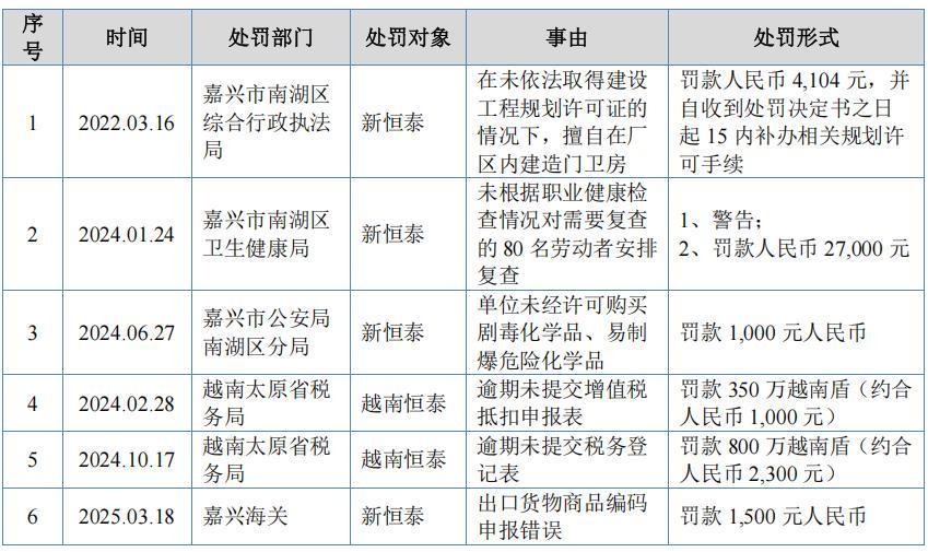 报告期内,新恒泰及子公司因工程建设、职业健康、危化品采买、税务等方面违法违规行为,多次受到罚款等行政处罚。