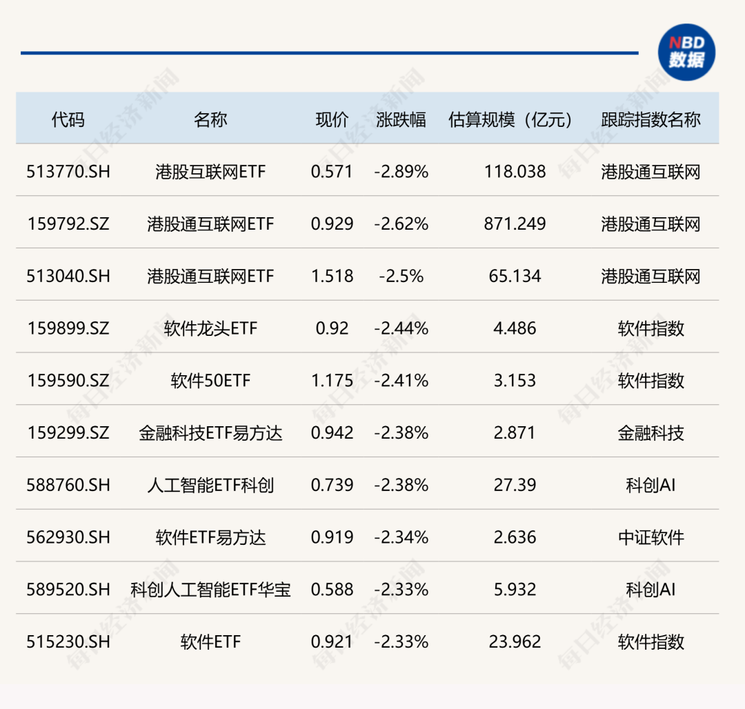 与化工板块形成鲜明对比的是,港股互联网相关ETF当日表现低迷,跌幅均超过2%。跟踪恒生互联网科技业指数的ETF产品净值回撤明显,部分跨境ETF跌幅居前。