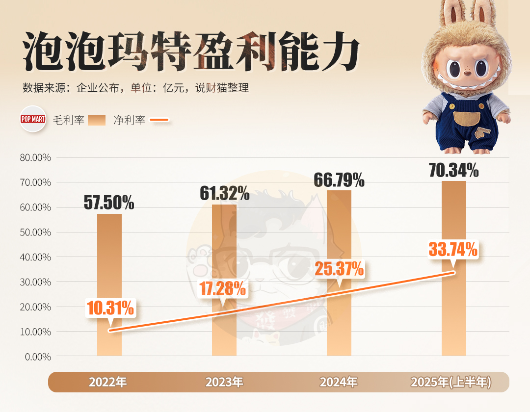 毛利率70.34%,净利率33.74%,相当于100块钱的公仔,成本只要不到30块,而泡泡玛特每卖出一只公仔,就能净赚近34元。这么好的生意,就问还有谁?!