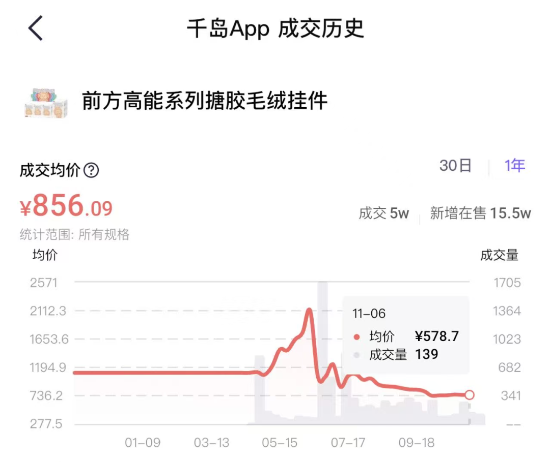 以LABUBU为例,前方高能系列搪胶毛绒挂件成交均价,已经从巅峰时期的超过2000元,一路跌至600元以下。最新价格报578.7,跌幅超过七成。