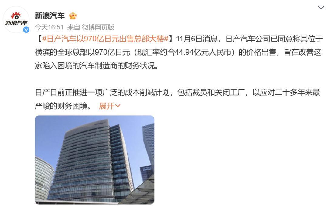 11月6日,据多家权威媒体报道,日本知名汽车制造商日产汽车正式宣布,将出售其位于神奈川县横滨的全球总部大楼。此次交易的买方为一家由在香港上市的汽车零部件制造商敏实集团支持的财团,出售价格高达970亿日元(约合45亿元人民币)。这笔资金将被日产汽车用于改善当前严峻的财务状况。