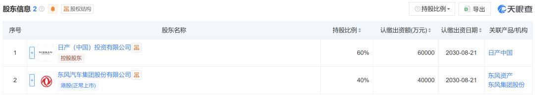 天眼查信息显示,日产进出口(广州)有限公司法定代表人为市川敦,注册资本为10亿元人民币,是一家以从事软件和信息技术服务业为主的企业。股东信息显示,该公司由日产(中国)投资有限公司和东风汽车集团股份有限公司两家公司共同持股,持股比例分别为60%和40%,体现了双方深厚的合作基础。