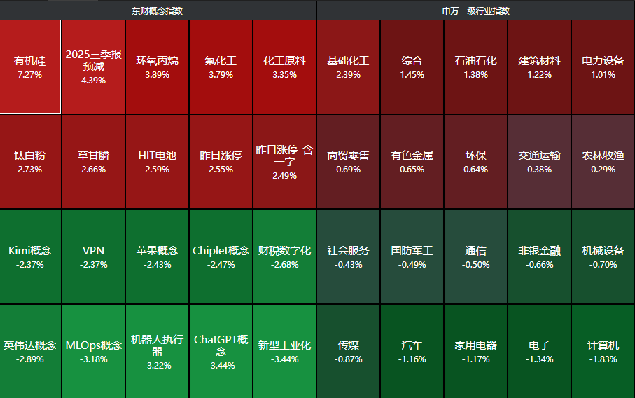 截至收盘,上证指数下跌0.25%,创业板指跌0.51%;港股市场表现更弱,恒生指数跌0.92%,恒生科技指数跌1.80%。行业板块呈现明显分化,化工、石油石化、电力设备等周期板块领涨,计算机、电子等科技板块跌幅居前。这种结构性行情反映出市场对宏观经济数据与产业政策的双重考量。