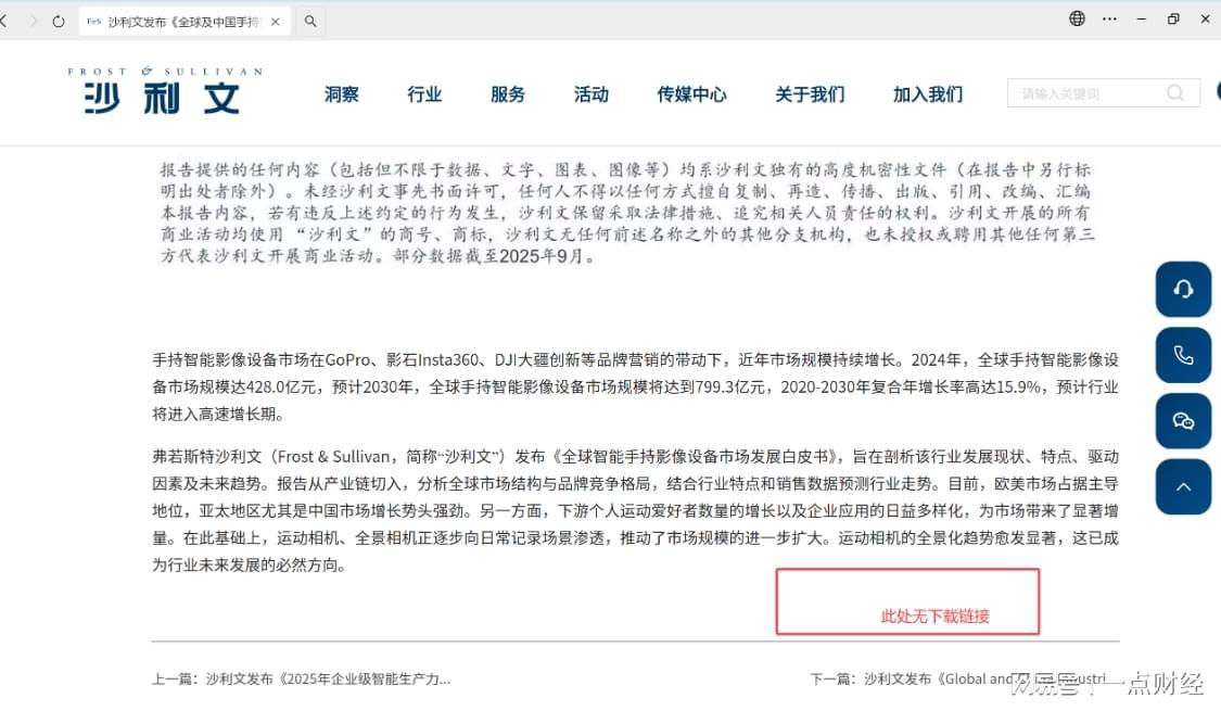 然而,沙利文的报告却给出了完全相反的结论。影石仍以75%的全球市占率稳居第一,大疆仅获得17.1%的份额。更令人疑虑的是,这份报告发布后经历了两次“下架”,至今无法在沙利文官方渠道获取,所谓“内部数据核查”的解释,让其可信度大打折扣。