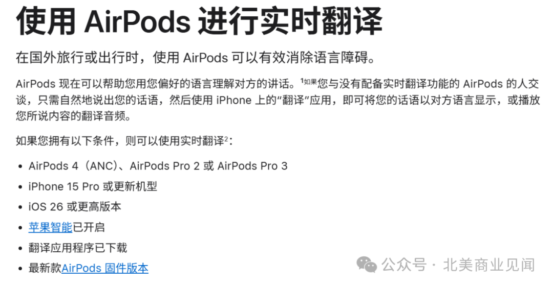 苹果称,只要拥有AirPods 4(ANC)、AirPods Pro 2或AirPods Pro 3,配合运行iOS 26的iPhone 15 Pro或更新机型,就可以利用手机自带的Apple Intelligence功能,将自己说的话翻译成对方可以理解的语言,向对方显示或是播放出来。