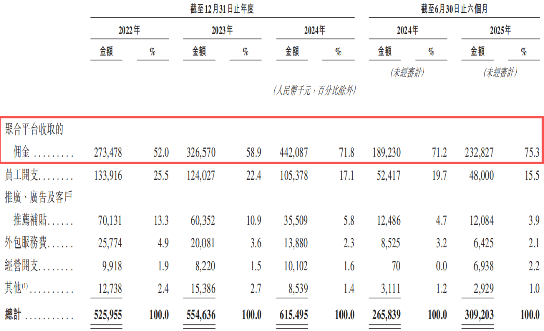 尽管背靠大树,享道出行的业绩却持续承压。2022年至2024年,其网约车服务订单量从约1.473亿单增长至2.233亿单,但订单高度依赖高德打车、滴滴、美团等聚合平台。2022年至2024年,超九成订单来自聚合平台,2025年上半年这一比例更是高达98.6%。佣金压力直接推高销售开支:2024年向聚合平台支付佣金4.42亿元,占销售开支比重超七成。