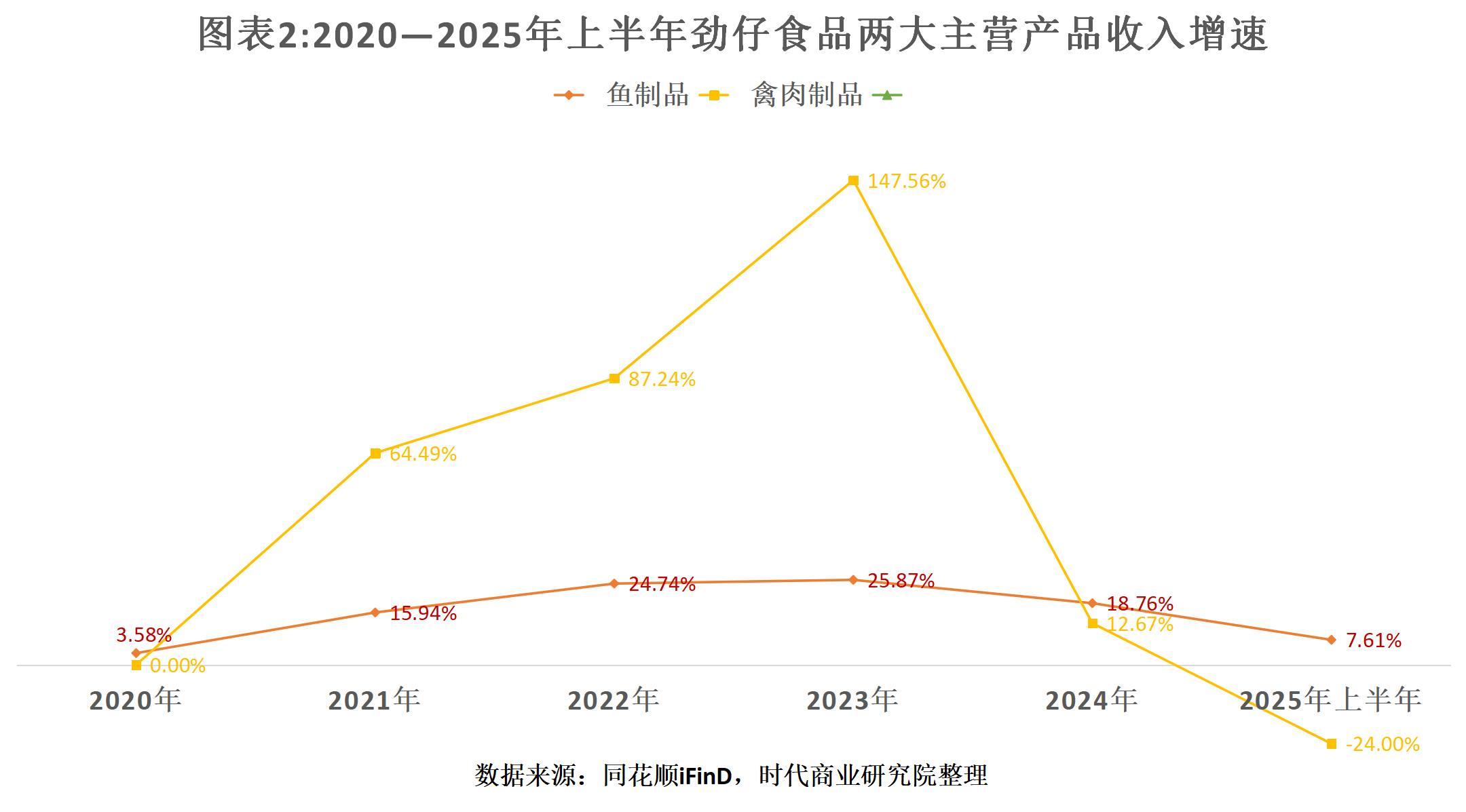 同花顺iFinD数据显示,2023至2024年,劲仔食品禽肉制品收入占比大幅提升到21%左右,成为第二大收入来源。而2025年上半年,其收入占比降至17.45%。