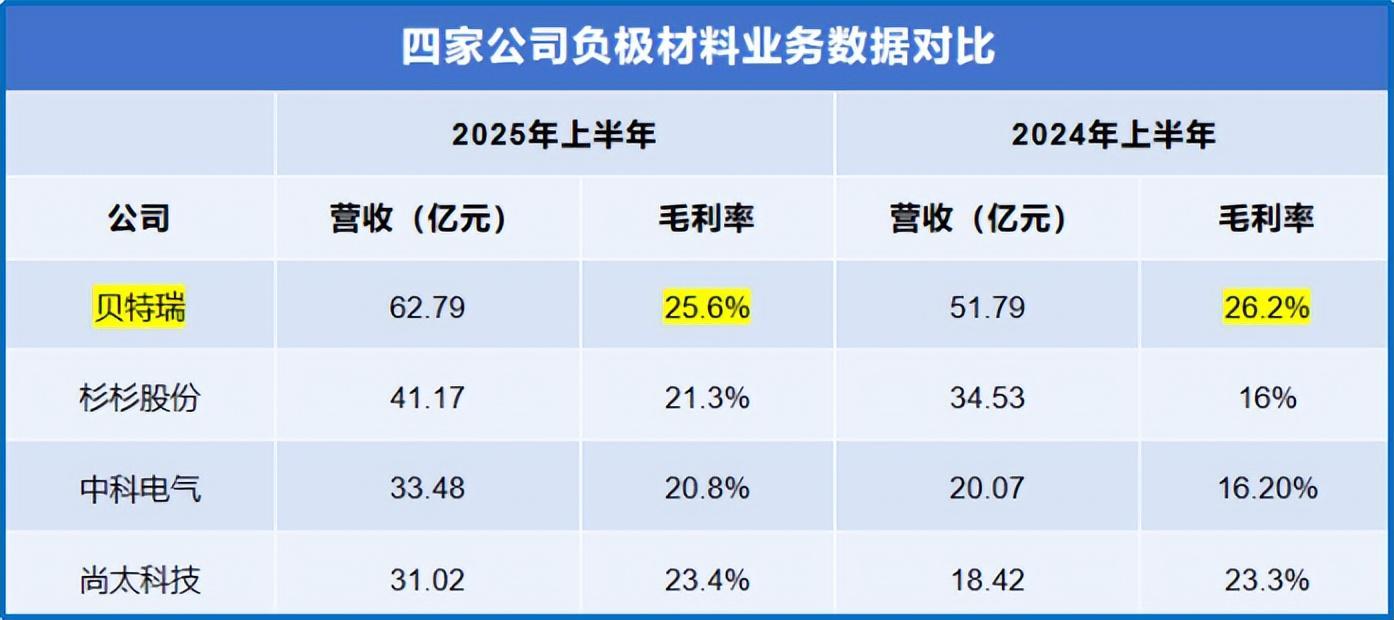 2025年上半年,贝特瑞负极材料业务毛利率为25.6%,高于同行杉杉股份的21.3%、中科电气的20.8%,一体化战略成效显著。