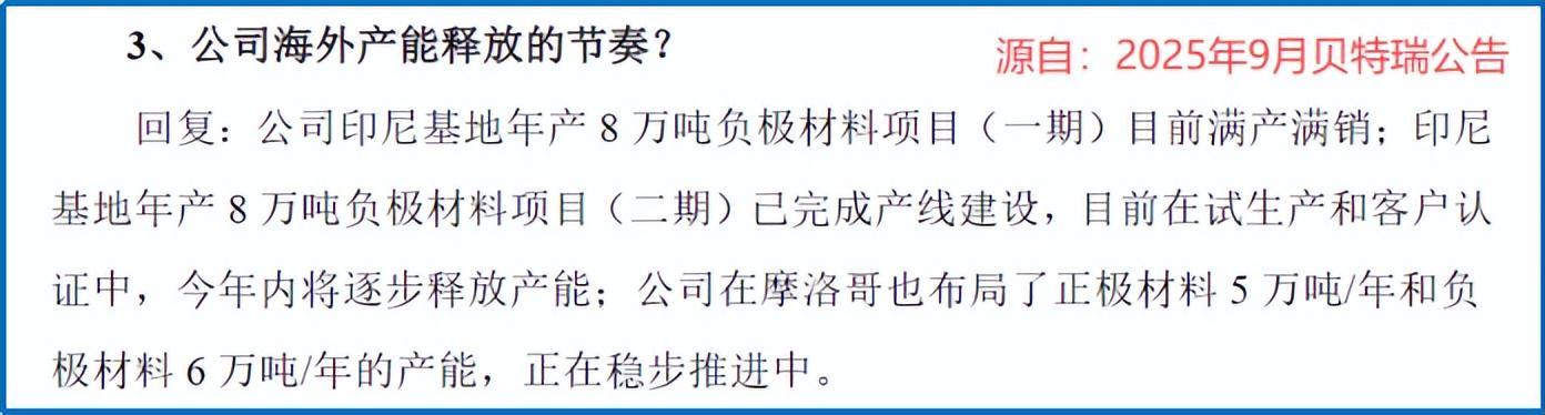 近年来,锂电池企业纷纷出海,贝特瑞作为中国负极材料行业首家出海企业,步伐快且稳。2024年8月,其印尼工厂年产8万吨负极材料项目投产,目前已满产满销,填补印尼该领域空白。此外,贝特瑞在摩洛哥布局产能,凭借优越地理位置辐射欧洲、中东及非洲市场,扩大市场覆盖,提升海外服务能力,增强供应链韧性。