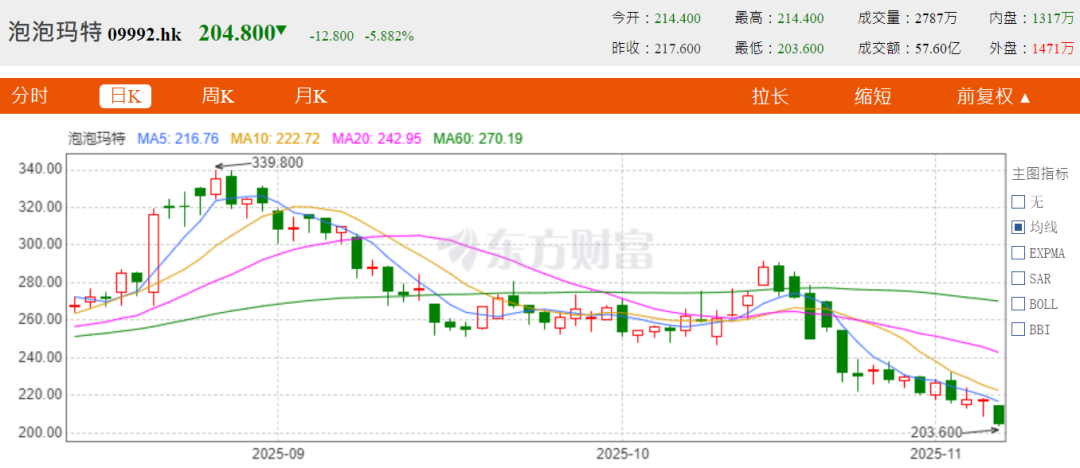 与此同时,11月7日泡泡玛特港股早盘下挫,截至收盘股价跌幅近6%,报204.8港元,创下近5个月新低。