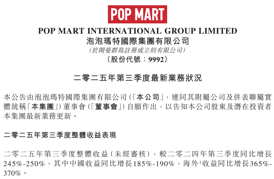 最新泡泡玛特的三季度业务状况披露,泡泡玛特第三季度整体收益较上年同期增长245%-250%。其中,中国收益同比增长185%-190%,海外收益同比增长365%-370%。从具体地区看,美洲市场同比增长1265%-1270%,欧洲及其他地区同比增长735%-740%。