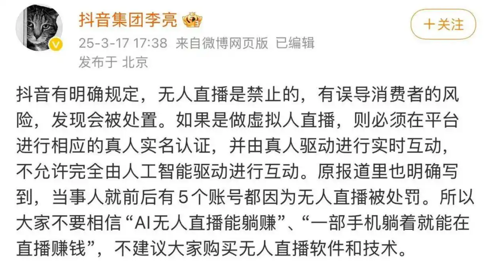 抖音集团副总裁李亮在社交平台回应称,经核查,被曝光的“三个直播间同时开播”案例并非发生在抖音平台。但平台确实存在利用AI仿冒名人带货的短视频内容,这类行为严重损害了创作者、商家及平台的信誉。抖音已开展专项治理工作,以遏制此类侵权行为。