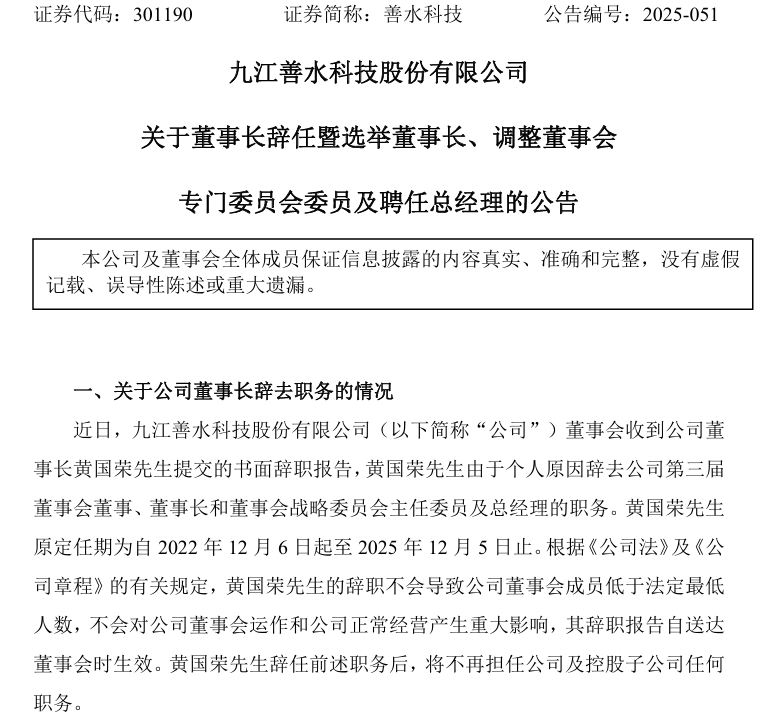 针对黄国荣辞职的影响,善水科技表示,根据公司法及《公司章程》的有关规定,黄国荣的辞职不会导致公司董事会成员低于法定最低人数,不会对公司董事会运作和公司正常经营产生重大影响,其辞职报告自送达董事会时生效。黄国荣辞任前述职务后,将不再担任公司及控股子公司任何职务。