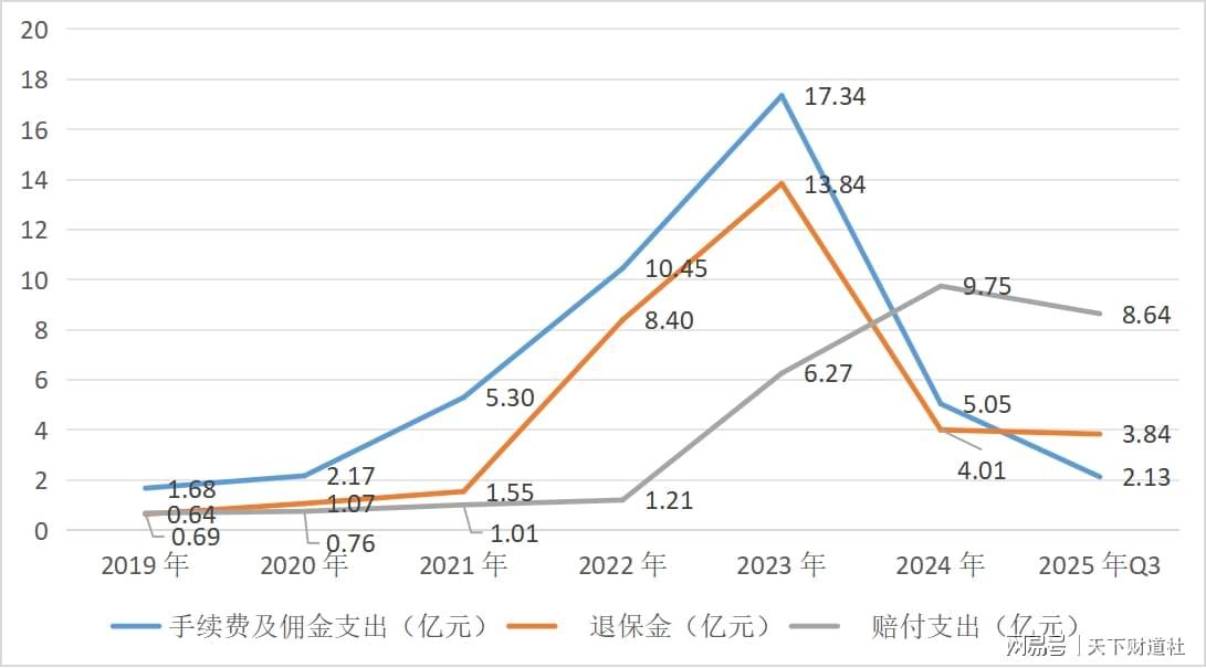 数据显示,公司手续费及佣金支出自2019年起五年内增长932%至2023年超过17亿元;同期退保金从0.64亿增至超过13亿;赔付支出从0.69亿增至超过6亿元,严重压缩利润空间。