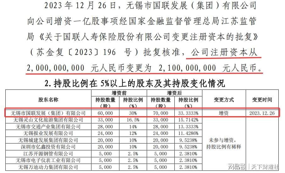2023年,国联人寿启动首轮增资,第一大股东国联发展集团出资1亿元,持股比例升至33%,注册资本金升至21亿元。