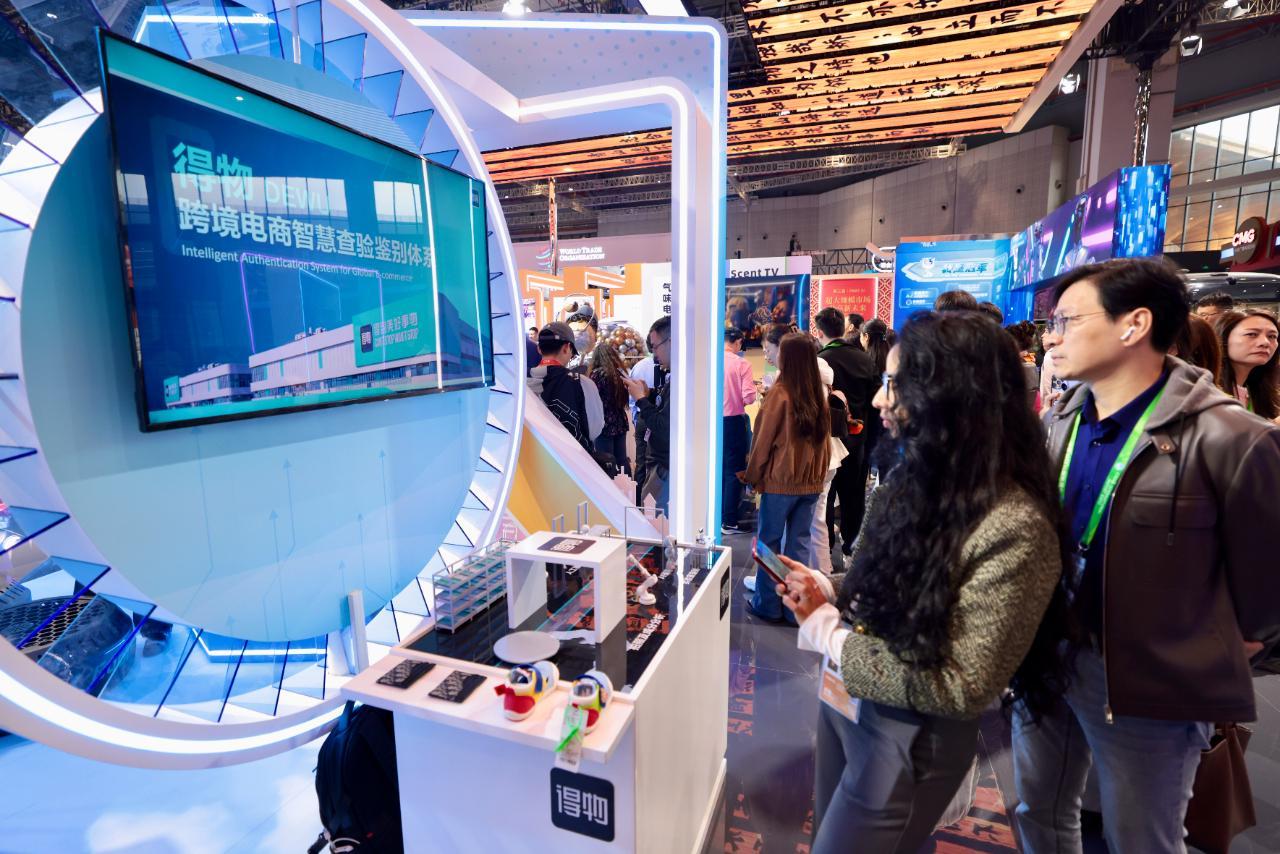 作为国内科技企业的代表之一,得物App此次在国家展中国馆展示了其自主研发的“人工智能查验鉴别系统”,吸引了众多参展者的目光。记者在现场看到,工作人员将一只鞋子模型置于检测平台后,仪器搭载的高清相机迅速启动,对该模型的表面logo、材质纹理等核心鉴别点进行了全方位的高清拍摄。借助图像识别技术完成数据采集、分析和比对后,仅几秒钟,一份包含真伪判定的鉴别报告便同步生成,高效完成了商品查验鉴别的全流程。