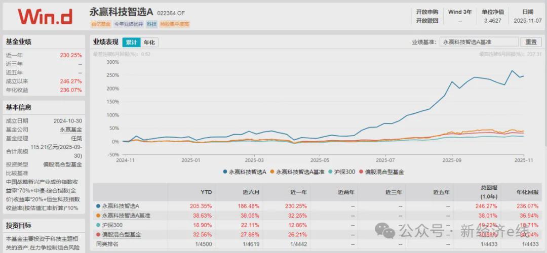 Wind数据显示,今年以来回报率超100%的主动权益基金达69只,其中永赢科技智选A以205.35%的净值增长率领跑全市场。该基金成立仅1年出头,基金经理任桀凭借对云计算产业链的精准布局,成功捕捉到行业爆发机遇。其前十大重仓股集中于光通信、PCB和算力领域,包括新易盛、中际旭创等龙头企业,持股集中度高达73.25%。