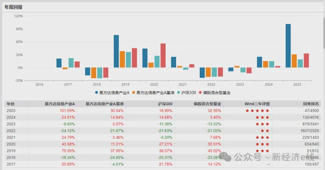 老牌基金公司亦展现强劲实力。易方达基金以9只翻倍基领跑行业,其中易方达信息产业A成立9年来基金经理未发生变更,郑希自2016年管理至今实现17.08%的年化回报。该产品年内收益超100%,管理规模近200亿元。