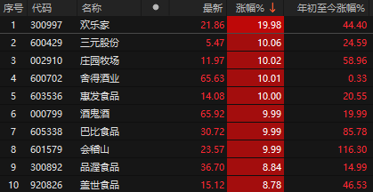 A股消费板块表现强劲,中国中免、舍得酒业、酒鬼酒、会稽山、欢乐家等多股涨停。