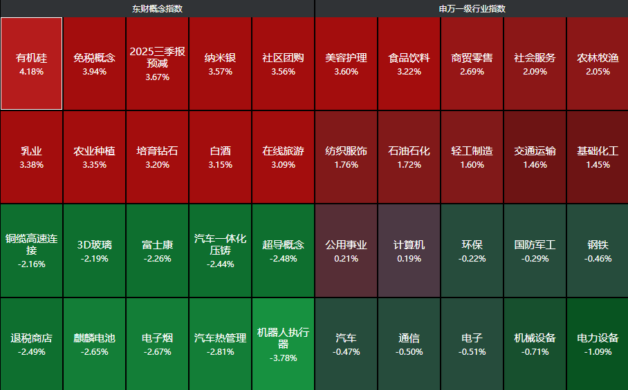 截至收盘,上证指数涨幅为0.53%,创业板指跌幅为0.92%,市场成交额放量至2.19万亿;港股恒生指数涨幅为1.55%,恒生科技指数涨幅为1.34%。分行业来看,美容护理、食品饮料、商贸零售、社会服务、农林牧渔等行业领涨,电力设备、机械设备、电子等行业领跌。