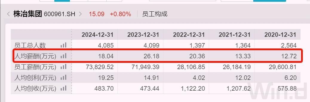公司业绩持续向好,2025年前三季度净利润达8.6亿元,同比增长48%,已超去年全年。这一成绩或为员工薪酬提升奠定基础。万得大数据显示,2024年末,株冶集团职工总数约4100人,人均创利19.3万元,同比增加4.3万元;人均税前薪酬18万元,虽较2023年有所减少,但在株洲上市企业中仍位列第三。