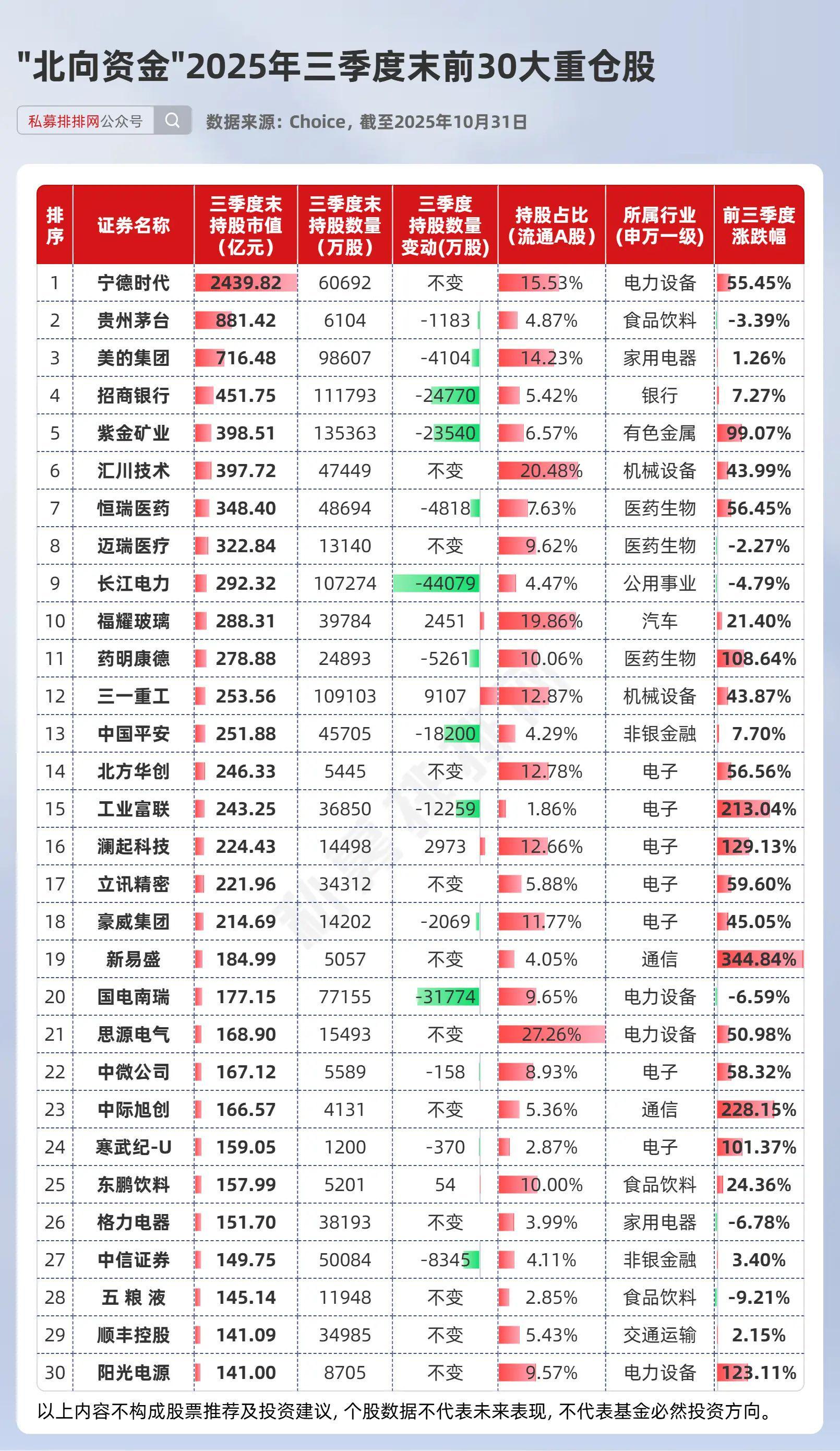 被视为“聪明资金”的北向资金三季度末持有3577家A股公司,总市值2.58万亿元。其前30大重仓股合计市值1.04万亿元,单只个股持仓均超140亿元,行业分布与公募基金高度重叠:电子行业占7席,电力设备占4席,食品饮料与医药生物各占3席。