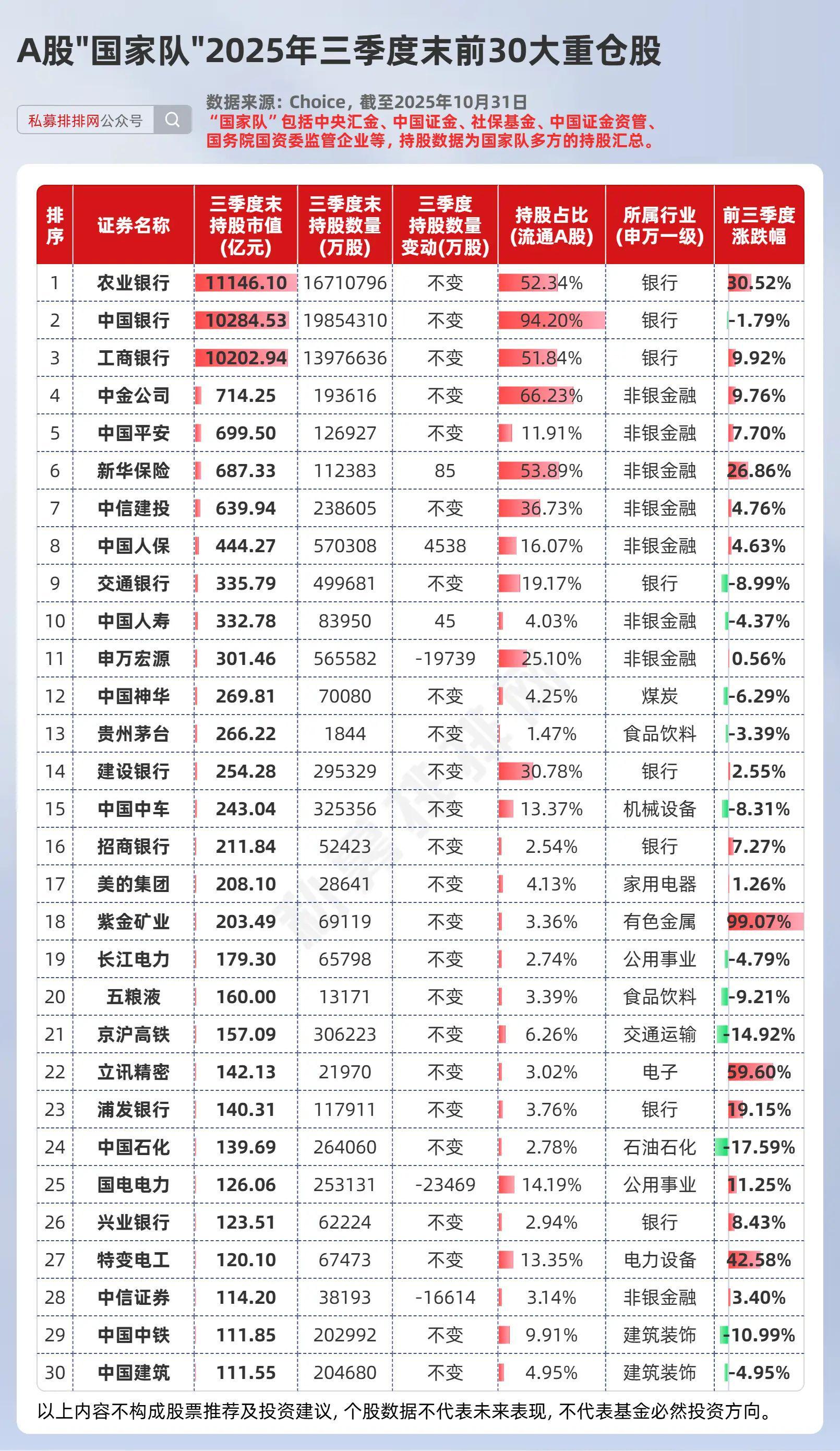 由中央汇金、中国证金等组成的国家队三季度末现身801家上市公司,持仓市值4.47万亿元。其前30大重仓股合计市值3.91万亿元,单只个股持仓均超100亿元,行业集中于非银金融与银行:各占8席。农业银行、中国银行、工商银行三大国有行持仓市值均达万亿级别,合计占比超70%。