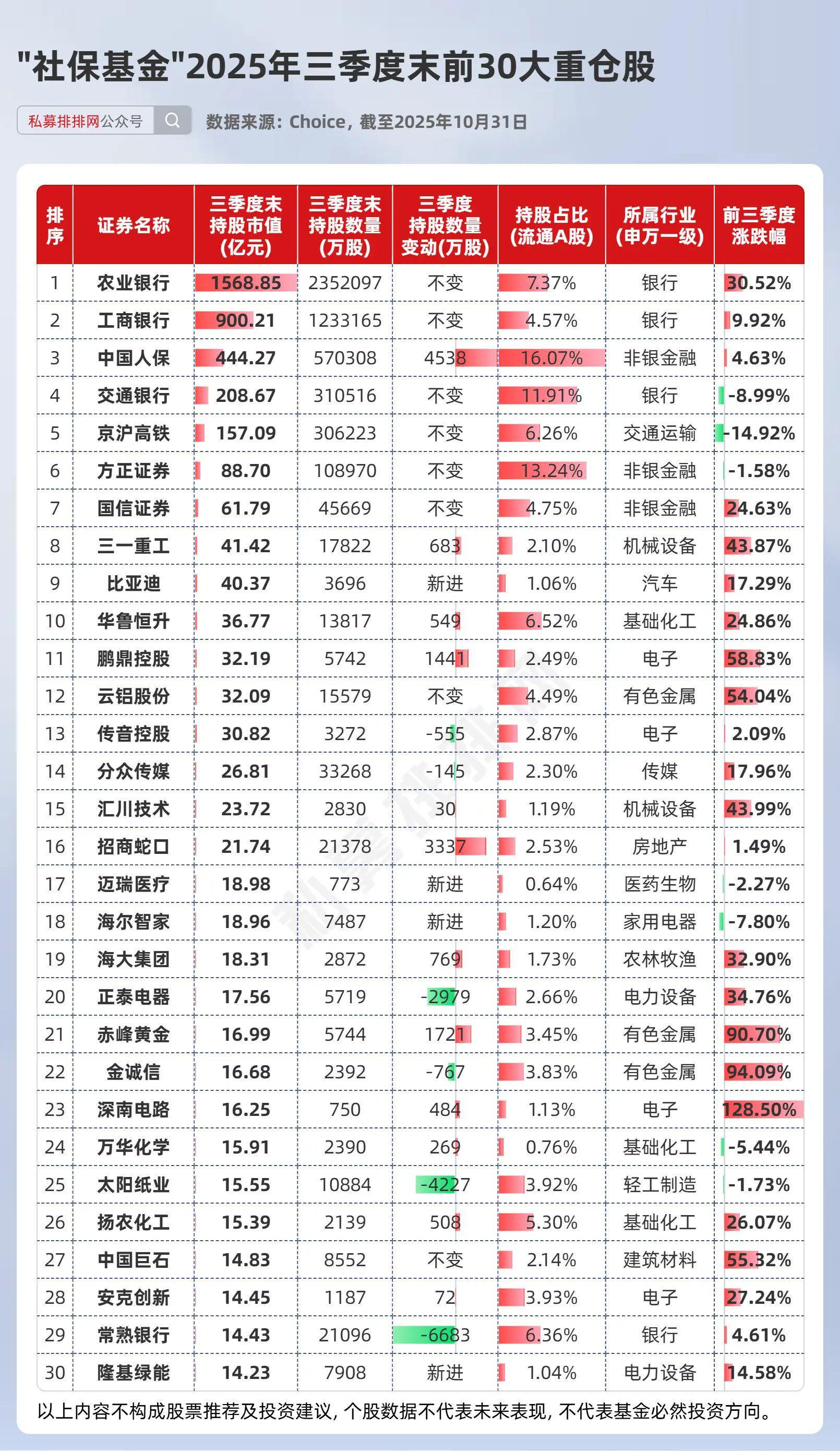 社保基金三季度末现身617家上市公司,持仓市值5526亿元。其前30大重仓股合计市值3944亿元,单只个股持仓均超14亿元,行业分布以金融与科技为主:非银金融与银行合计占7席,电子占4席,有色金属与基础化工各占3席。