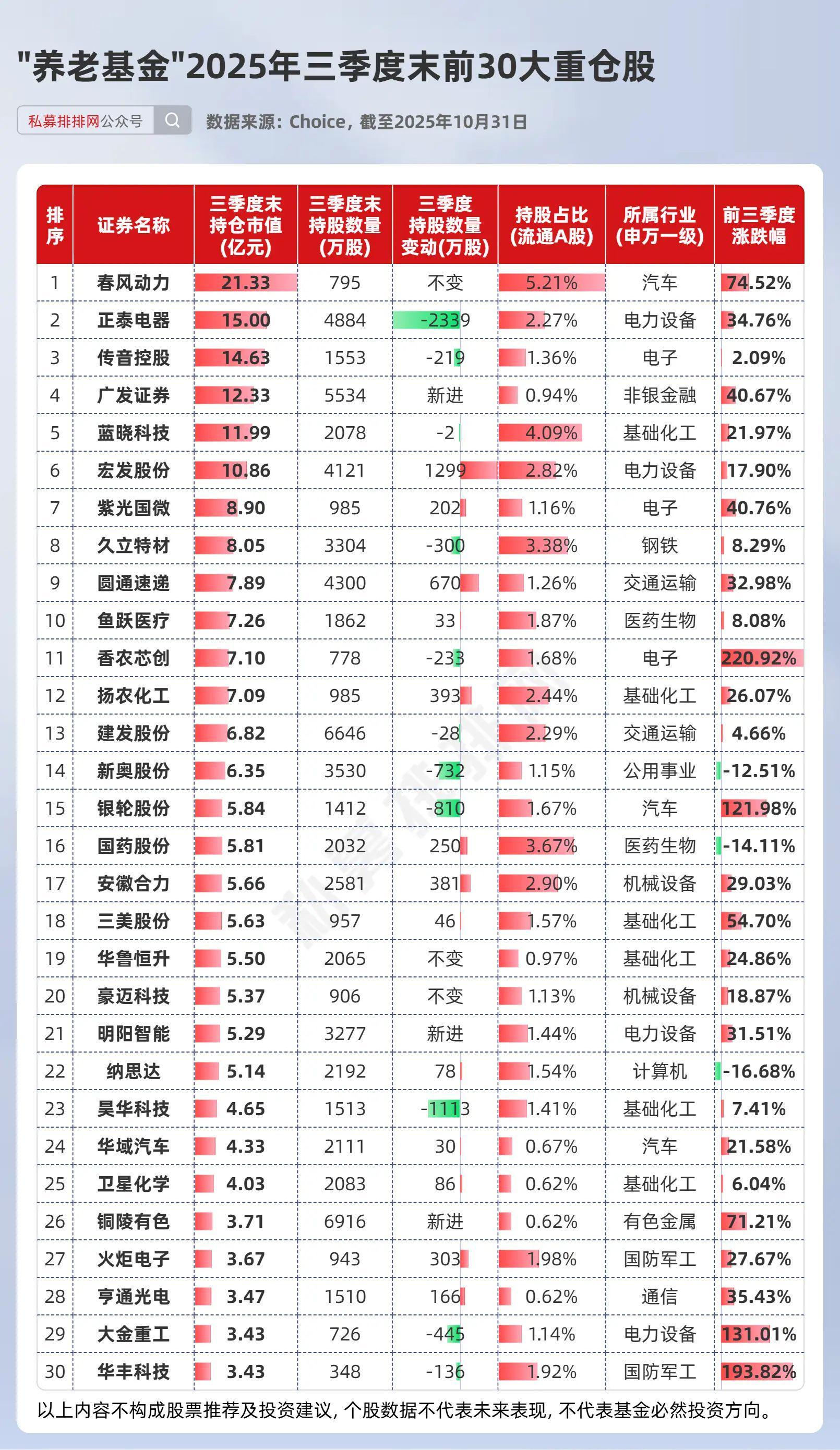 养老基金三季度末现身176家上市公司,持仓市值380.74亿元。其前30大重仓股合计市值220亿元,单只个股持仓均超3亿元,行业分布较为分散:基础化工占6席,电力设备占4席。前3大重仓股为春风动力、正泰电器、传音控股,其中春风动力年内涨幅超74%。