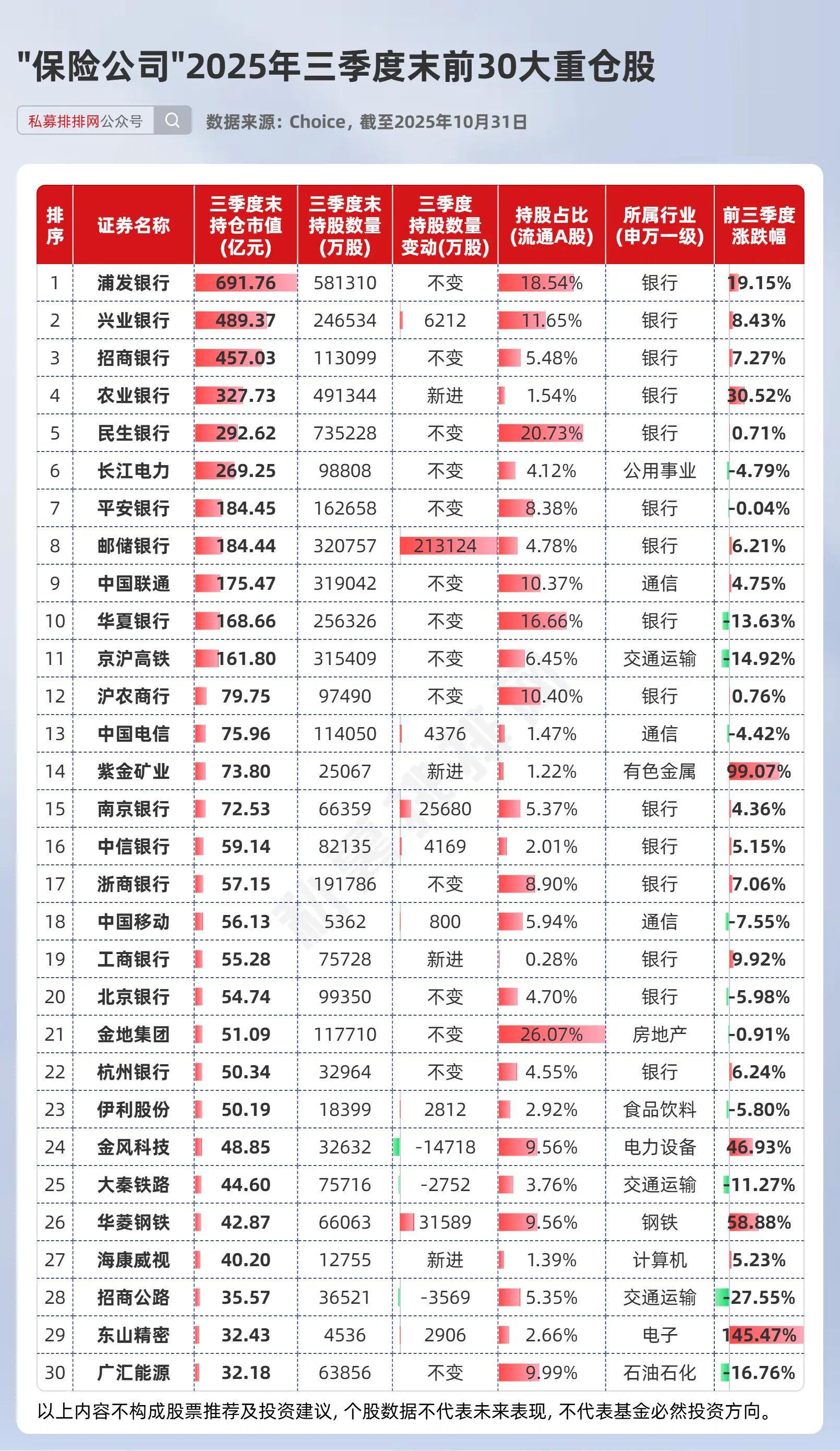 保险公司三季度末持仓市值6393亿元,前30大重仓股合计市值4415亿元,单只个股持仓均超32亿元,行业集中于银行:15家银行股占据半数席位。前3大重仓股为浦发银行、兴业银行、招商银行。尽管银行板块整体表现平淡,但PCB公司东山精密以145%的涨幅领涨险资持仓,新华人寿与中国人寿合计持有4536万股,持股市值32.43亿元。