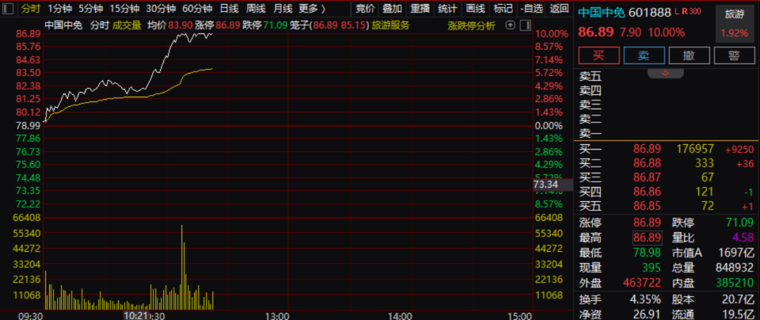 今日早盘,消费板块迎来爆发式行情!中国中免A股盘中直线拉升并触及涨停,H股一度涨超12%,成为引领消费股走强的标志性事件。受此带动,欢乐家、会稽山等多只个股涨停,白酒板块全线走强,大消费概念股集体异动拉升。
