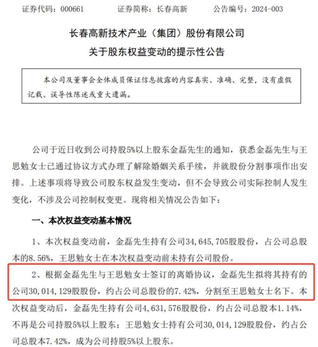 例如,长春高新实控人金磊离婚时,向前妻划转3000万股(市值约40亿元),占公司总市值7.42%。消息一出,股价连续下跌,股民吐槽:‘老板离婚,我们买单。’