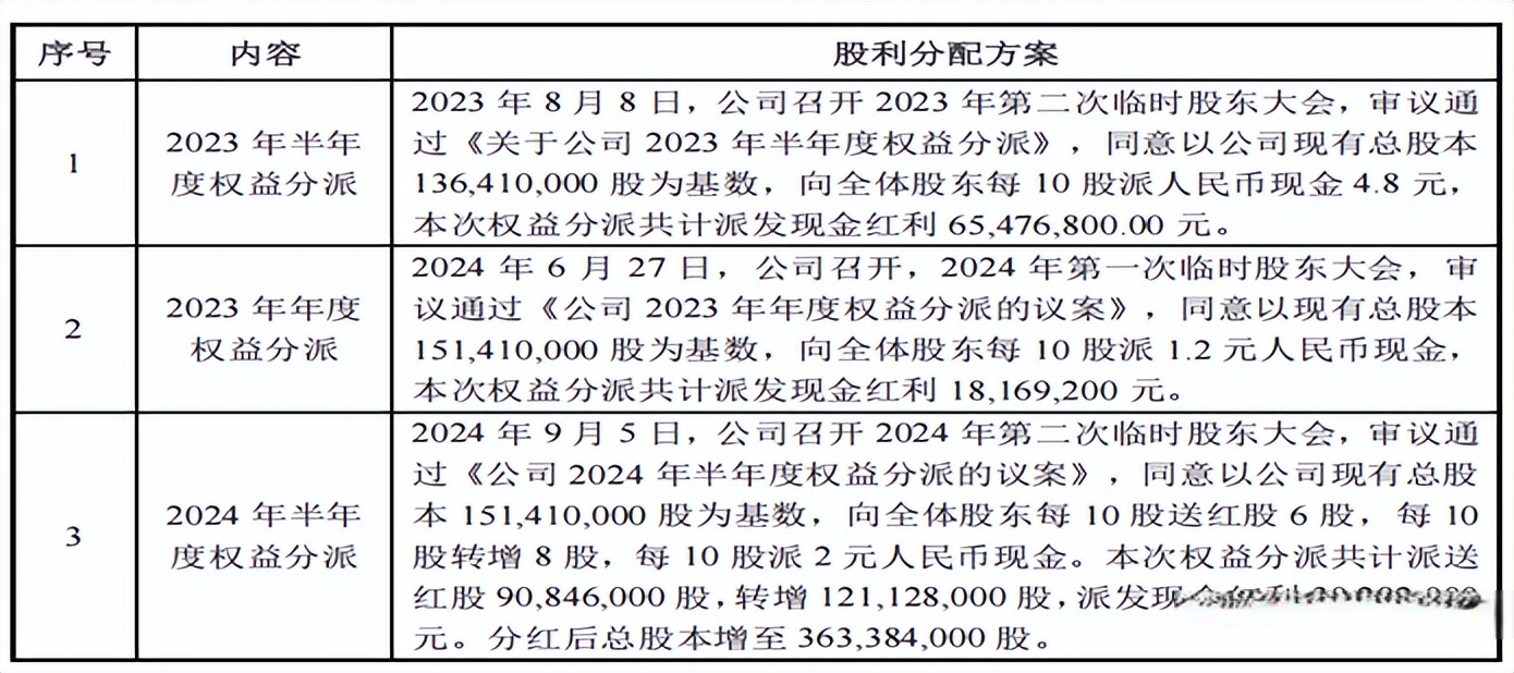 2023年8月8日,公司向全体股东每10股派人民币现金4.8元,本次权益分派共计派发现金红利6547.68万元;2024年6月27日,公司向全体股东每10股派1.2元人民币现金,本次权益分派共计派发现金红利1816.92万元;2024年9月5日,公司派发现金红利3028.2万元。