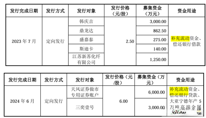 2023年7月,公司还进行了一次定向发行,用于补充流动资金、偿还银行借款,以2.50元/股的价格向韩庆吉等5位投资者合计发行2,211万股,募集资金总额为5,527.50万元;2024年6月,公司本次发行以6.00元/股的价格向天风证券等2位投资者合计发行1,500万股,募集资金总额为9,000.00万元。公司定向发行募集资金已按照募集资金用途使用完毕。