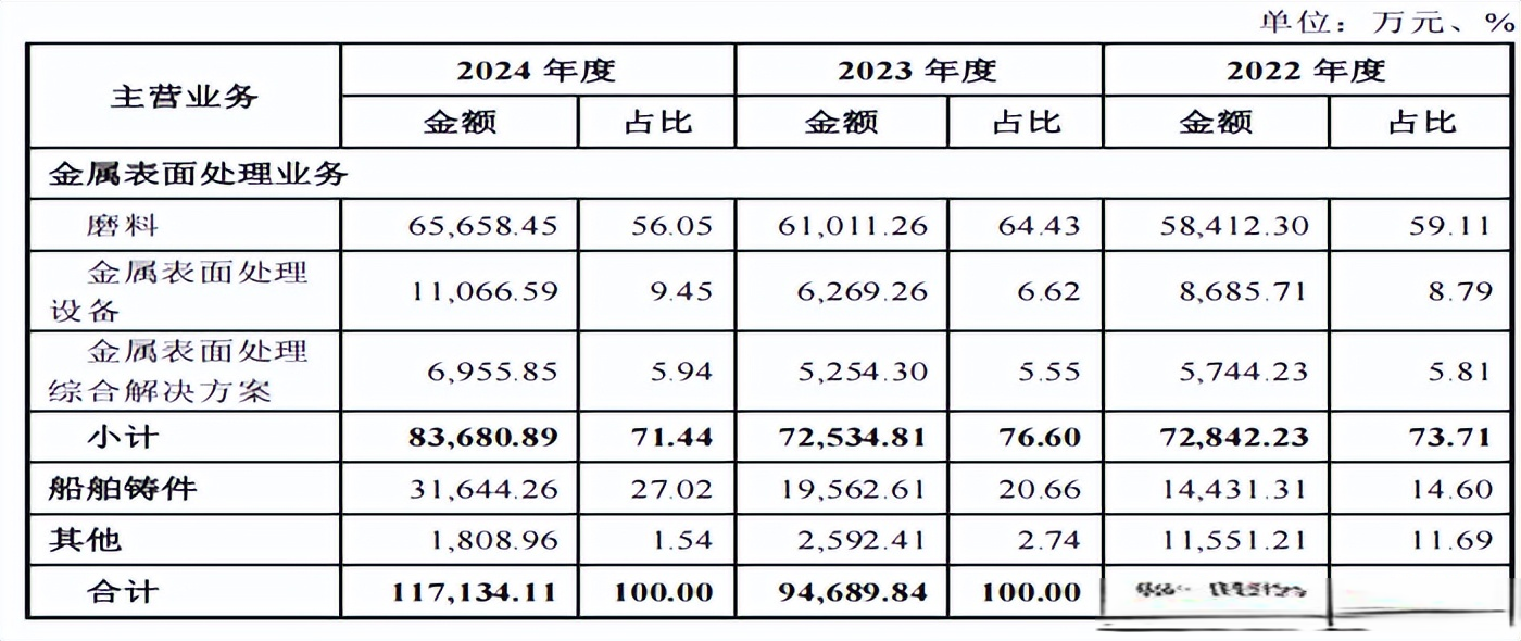 报告期内,公司磨料业务营业收入占各期主营业务收入的比例分别为59.11%、64.43%和56.05%,系公司收入的主要来源;金属表面处理设备营业收入占各期主营业务收入的比例分别为8.79%、6.62%和9.45%;金属表面处理综合解决方案主要系公司开展的磨料承包业务,其营业收入占各期主营业务收入的比例分别为5.81%、5.55%和5.94%。