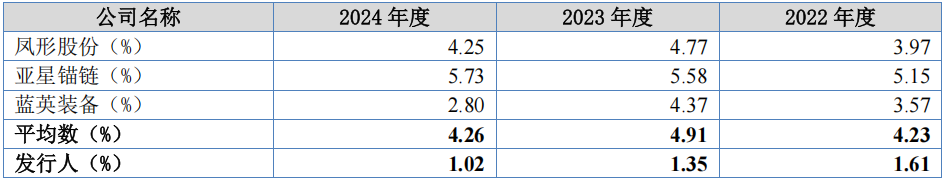 报告期内,公司研发费用分别为1,624.58万元、1,304.3万元和1,221.57万元,公司研发费用略有下降;公司研发费用率分别为1.61%、1.35%和1.02%,低于同行业可比公司平均水平4.23%、4.91%和4.26%。