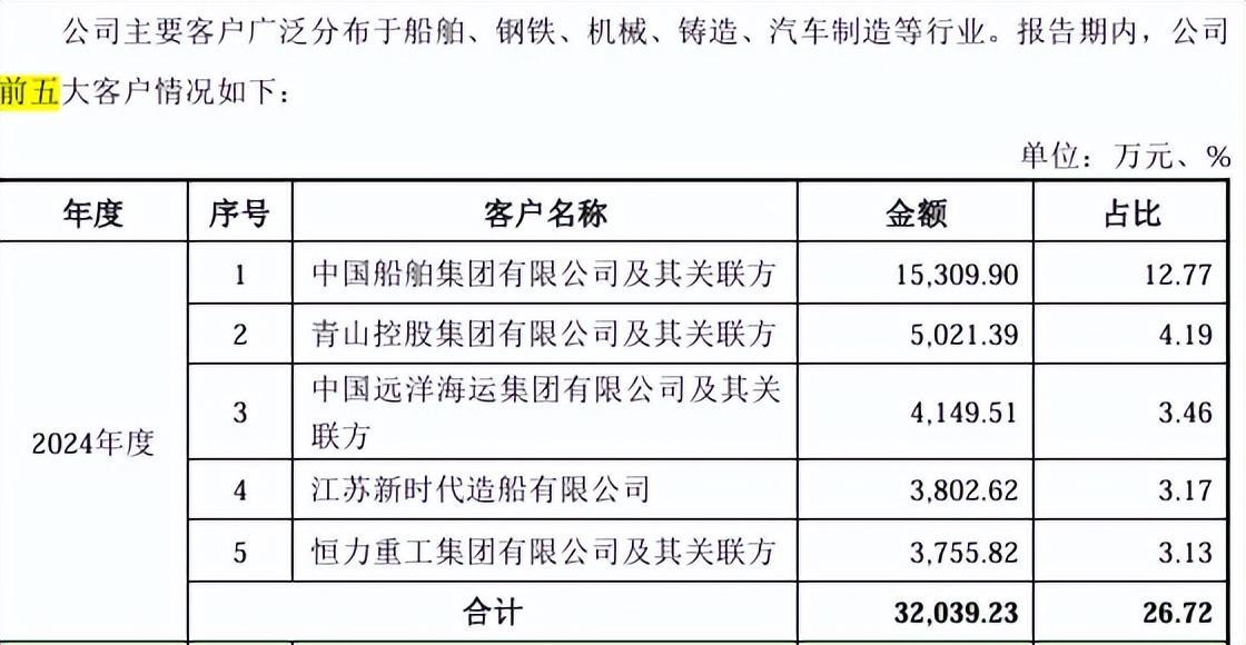 报告期内,大亚股份前五大客户销售收入分别为2.886亿元、2.24亿元和3.204亿元,占营业收入的比例分别为28.62%、23.14%和26.72%,公司客户较为分散。公司主要客户广泛分布于船舶、钢铁、机械、铸造、汽车制造等行业。