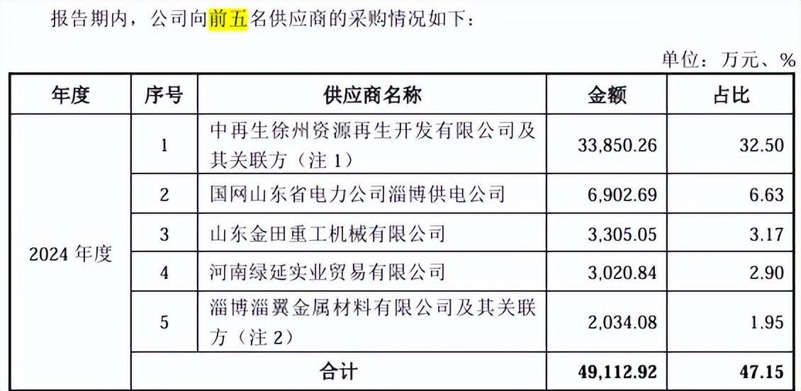 报告期内,大亚股份前五大供应商采购金额分别为4.341亿元、3.601亿元和4.911亿元,占采购总额的比例分别为48.14%、42.84%和47.15%。其中,淄博大亚再生资源有限公司系公司原子公司,公司原董事、副总经理韩志亮持有70%股权并担任法定代表人的公司;淄博中久金属科技有限公司、淄博嵩岳金属科技有限公司分别系由公司前员工崔汝江之父崔丙军持股66.67%和93%的公司;按照实质重于形式的原则,将前述3家企业认定为公司报告期内的关联方。