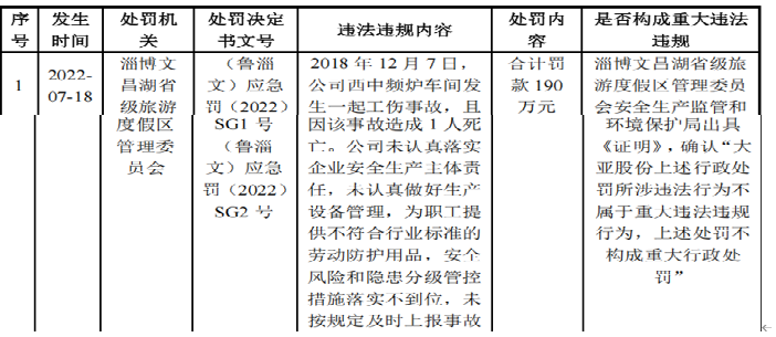 报告期内,公司存在下列6项行政处罚。特别是2022年7月18日进行的两次工伤合并处罚,2018年12月7日,公司西中频炉车间发生一起工伤事故,且因该事故造成1人死亡。公司未认真落实企业安全生产主体责任,未认真做好生产设备管理,为职工提供不符合行业标准的劳动防护用品,安全风险和隐患分级管控措施落实不到位,未按规定及时上报事故,还有一次是2019年1月18日工伤,淄博文昌湖省级旅游度假区管理委员会对其合计罚款190万元。