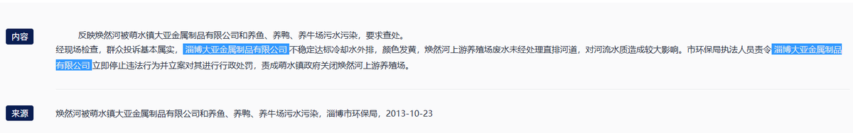 早在2013年,大亚股份曾因为不稳定达标冷却水外排,污染焕然河而被群众投诉,后被淄博市环保局立案对其进行行政处罚。